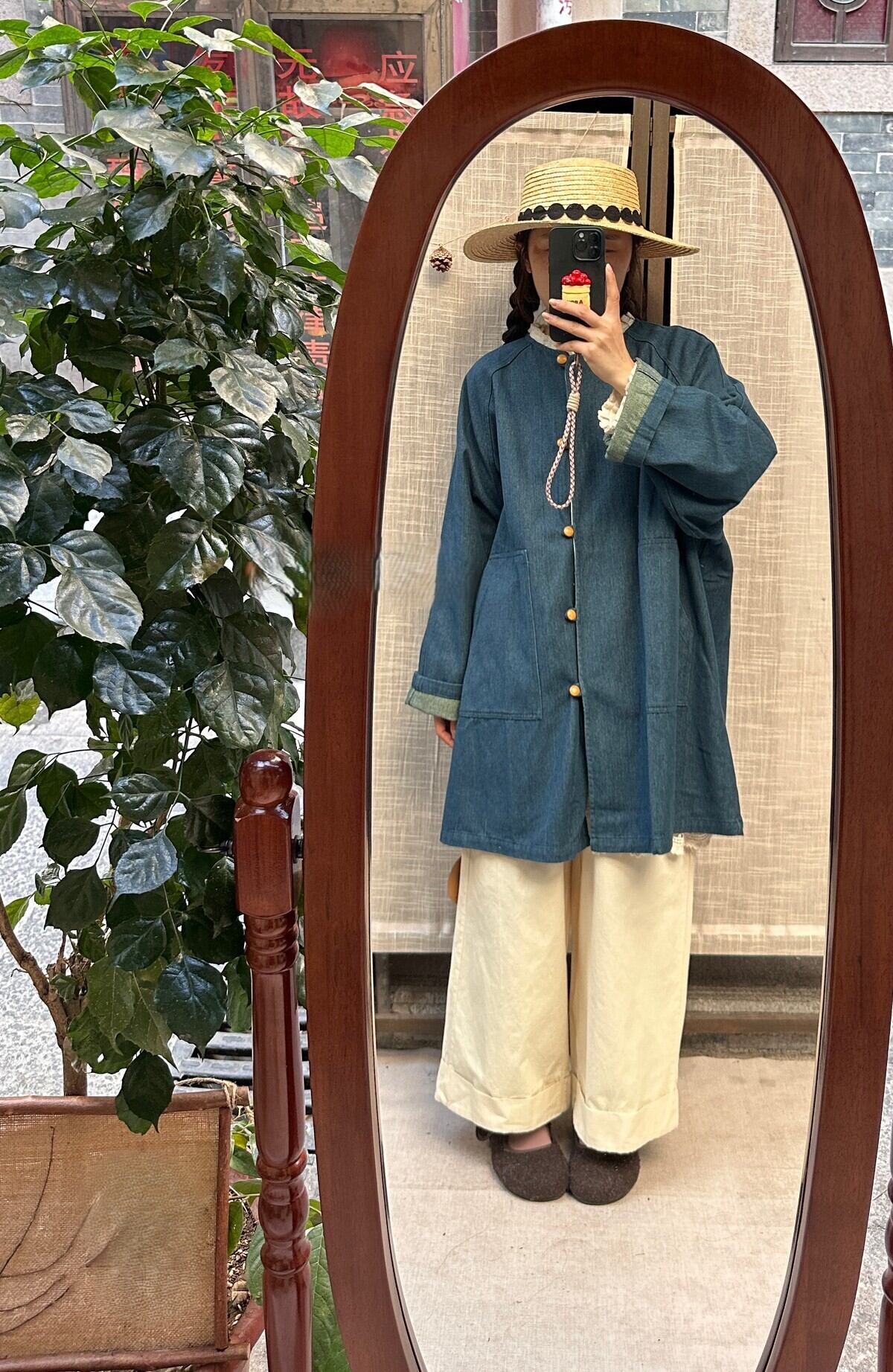 # 春の先取り!レトロ シンプルで豪華なラウンドネックルーズビッグポケット ミドル丈デニムジャケット